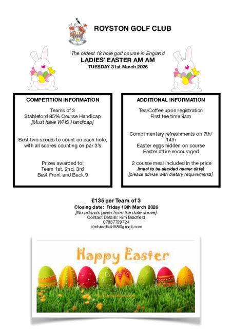 Entry form available from Kim Bradfield c/o Royston GC